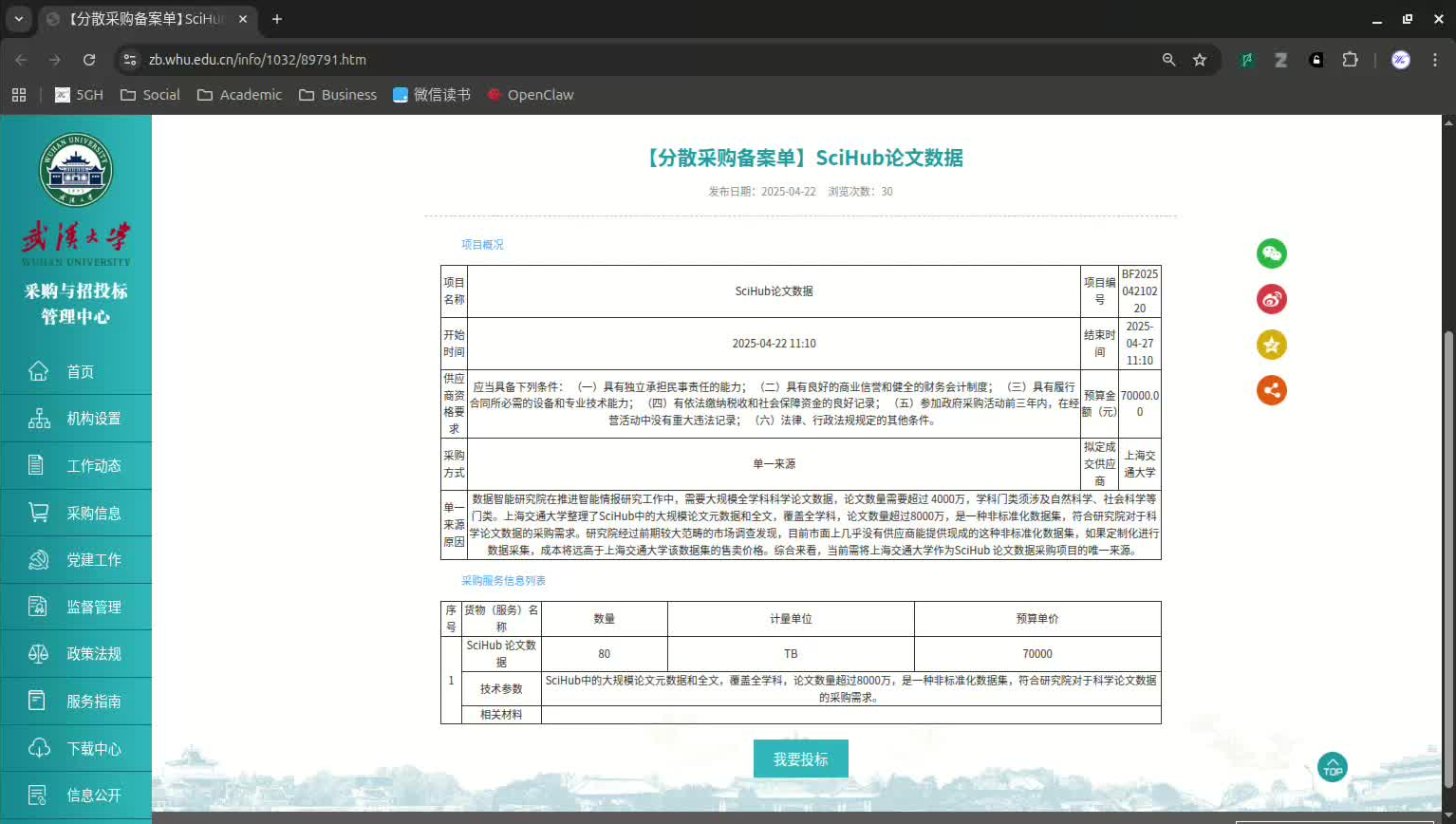 Recently, the 5GH Team obtained a document showing that Wuhan University purchased an 80TB Sci-Hub paper dataset from Shanghai Jiaotong University in 2025 for a tender price of 70,000 RMB, via a "single-source" procurement.