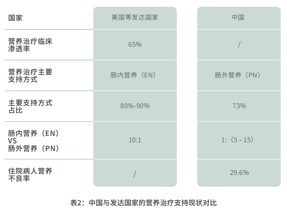 特殊医学用途配方食品市场的增长主要受老年人口,以及慢性疾病人口增长所推动。欧美市场的特殊医学用途配方食品主要以肠内营养产品(经胃肠道消化吸收)为主,但中国市场主要以肠外营养产品(直接经静脉输注)为主,预计未来以肠内营养产品会有可观的增长。