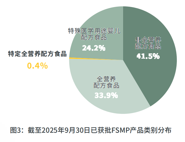 截止至 2025 年 9 月底,中国批准注册的特殊医学用途配方食品达到 277 款,其中 183 款产品在 2023 年以后注册。其中非全营养配方食品 115 款(占比 41.5%),全营养配方食品 94 款(占比 33.9%),特殊医学用途婴儿配方食品 67 款(占比 24.2%)。