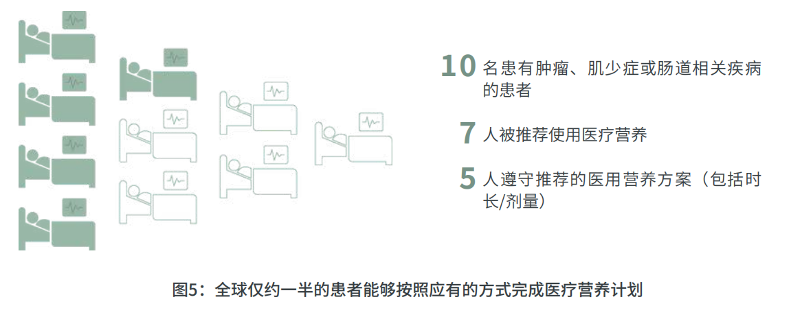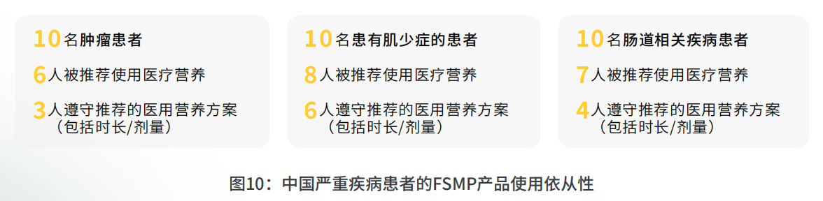 特殊医学用途配方产品在全球依然面临着患者依从性较低的挑战。研究显示,全球每 10 名患有肿瘤,肌少症,或者倡导相关疾病的患者,有 7 人被推荐使用特殊医学用途配方食品,但只有 5 人能够遵守推荐的方案(包括时长和剂量)。对于单日不依从的原因依次为:难以下咽或消化,不耐受,价格,味道等。但对于未能完成整个推荐周期最主要的原因是价格。