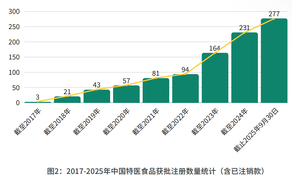 截止至 2025 年 9 月底,中国批准注册的特殊医学用途配方食品达到 277 款,其中 183 款产品在 2023 年以后注册。其中非全营养配方食品 115 款(占比 41.5%),全营养配方食品 94 款(占比 33.9%),特殊医学用途婴儿配方食品 67 款(占比 24.2%)。