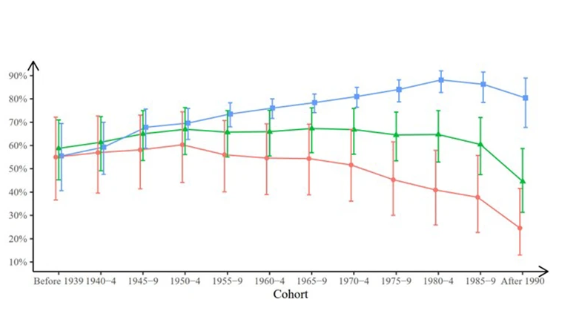 一项研究 [1] 分析了中国综合社会调查(Chinese General Social Survey)2006 年至 2017 年各轮次的数据显示,新近出生的居民,他们参与养老保险的比例正急剧下降。