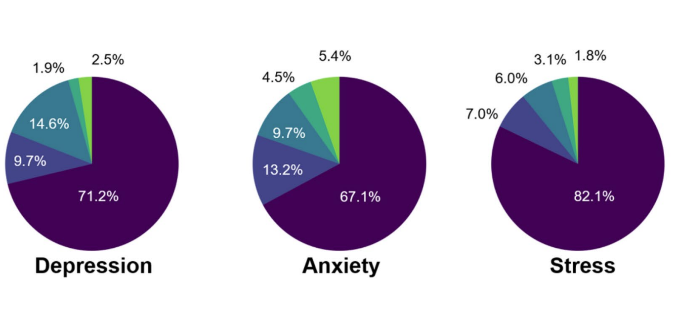 596 人回答了线上问卷,最终,来自于 18 所大学的 514 名大四牙科学生的问卷被纳入了统计。参与者研究人员利用 DASS-21(Depression Anxiety and Stress Scales)量表评估受访者是否存在抑郁,焦虑或者压力。
